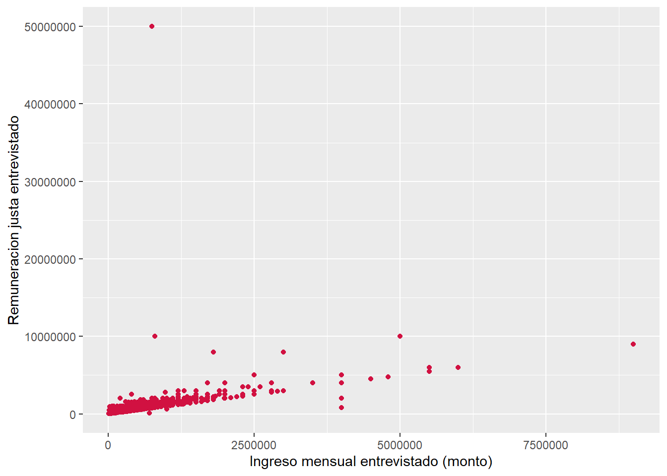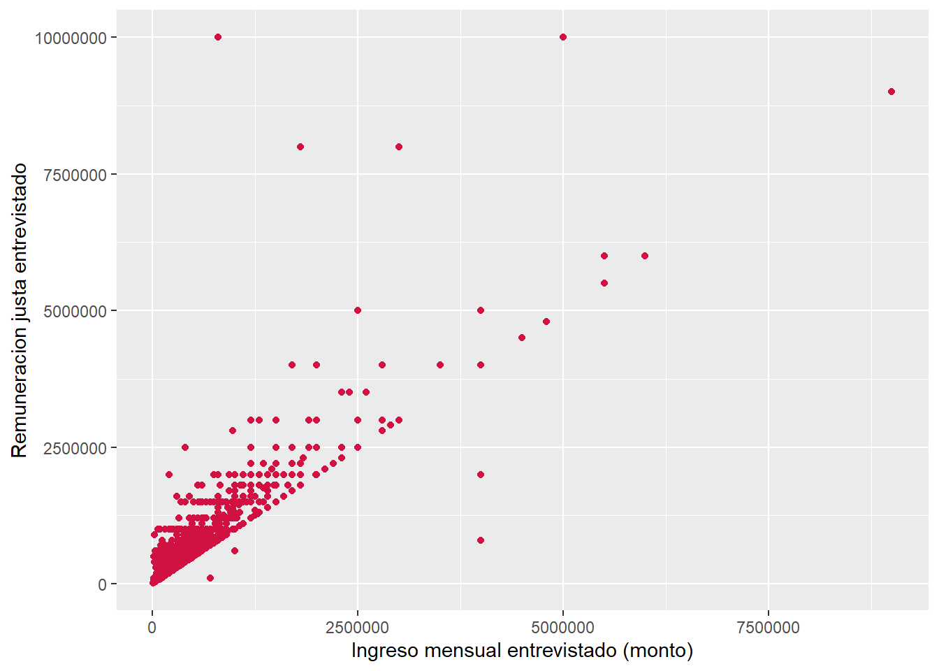 La asociación entre los ingresos reales y los ingresos justos es positiva, moderada y estadísticamente significativa (r = 0.47, p < .001). Por tanto, con un 95% de confianza se puede rechazar la \(H_{0}\) de no asociación entre variables, existiendo evidencia a favor de la \(H_{A}\) sobre una asociación significativa entre los ingresos reales y los ingresos justos.