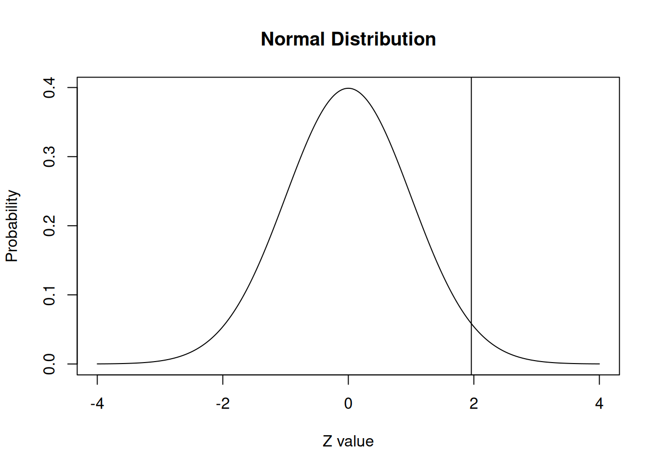 La respuesta nos dice lo que ya sabemos: el 97,5% de la distribución normal ocurre por debajo del valor z de 1,96.
