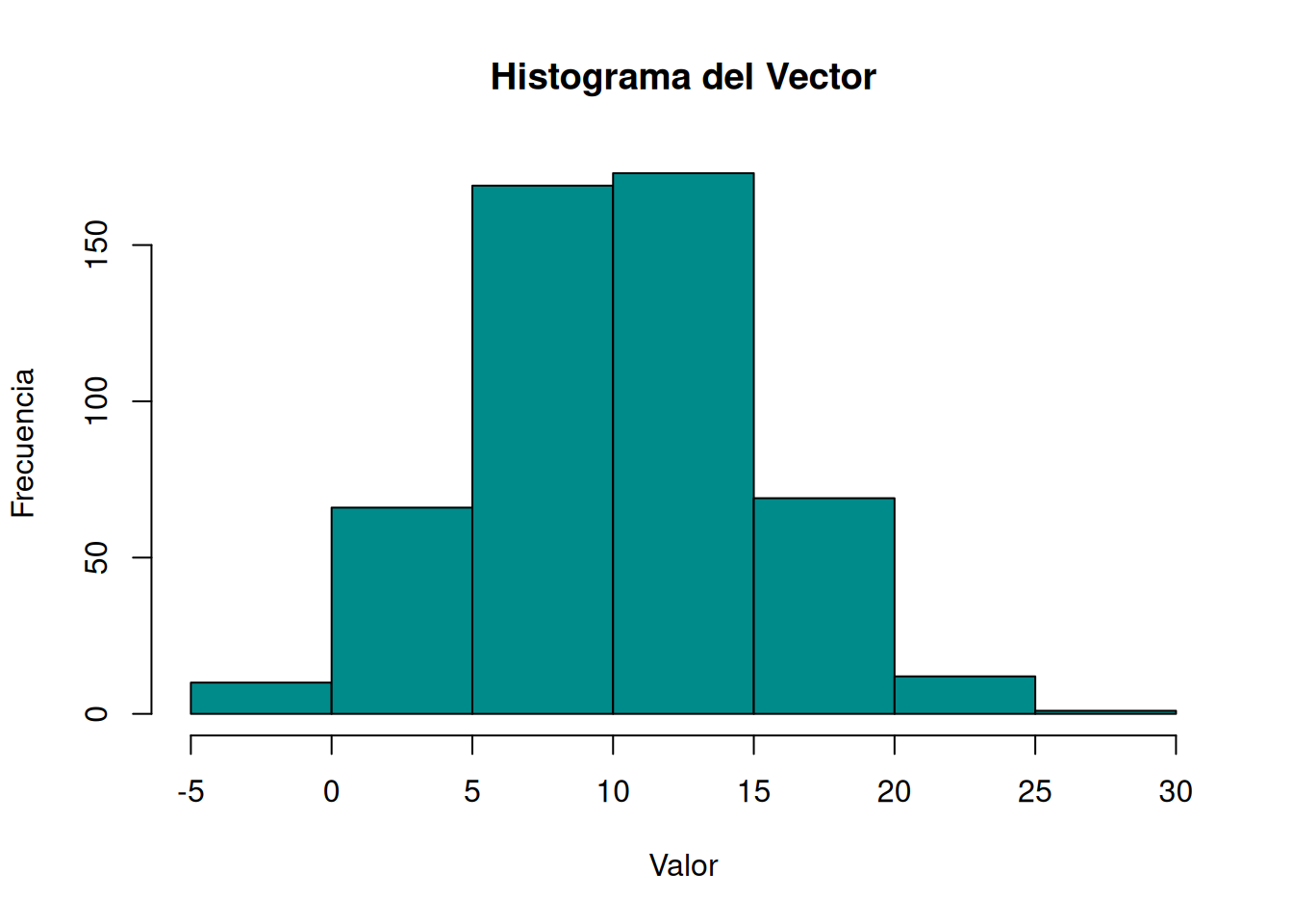 hist(vector2,main="Histograma del Vector",xlab="Valor",ylab="Frecuencia",col="cyan4",border="black")