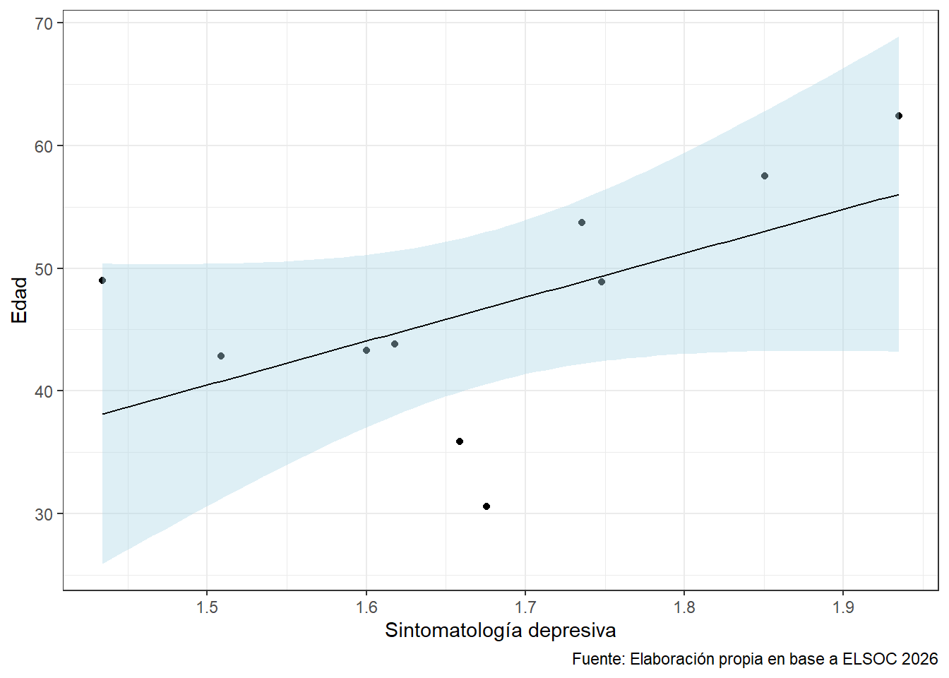 theme_bw()En la Figura 1 es posible apreciar… La correlación entre la edad y el promedio de la sintomatología depresiva corresponde a 0.0176236.