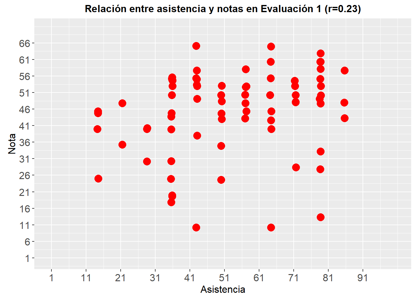 labs(title = "Relación entre asistencia y notas en Evaluación 1 (r=0.23)") +